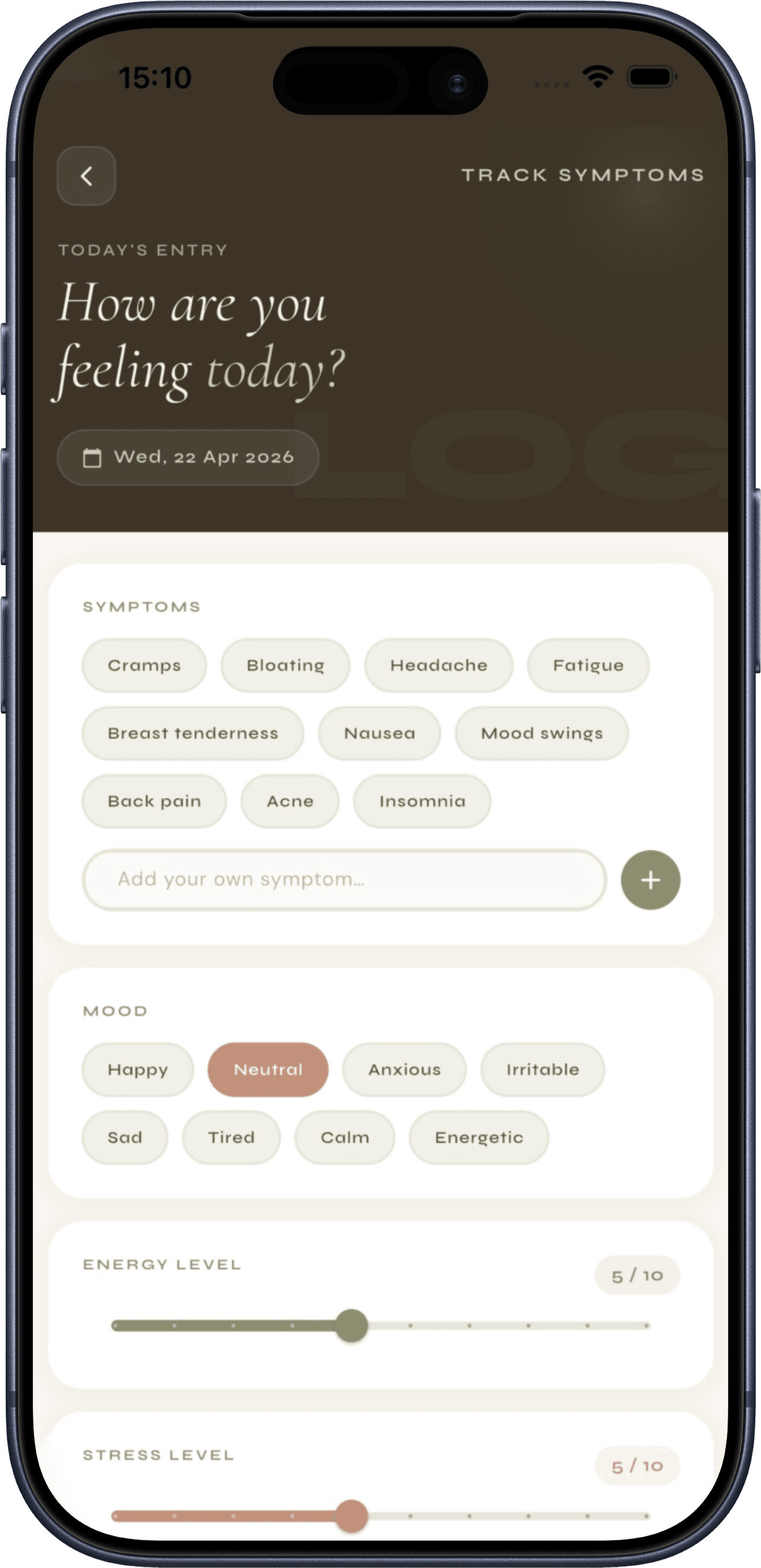 Log pain, cycles, and daily symptoms to better understand your body over time.